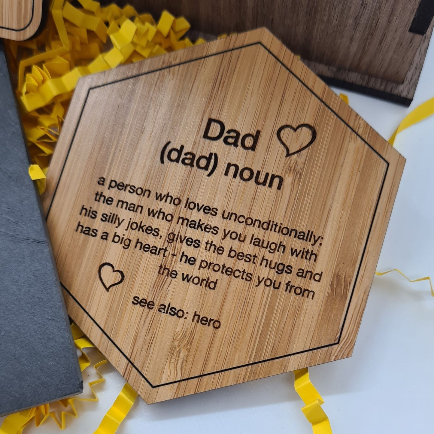 - Fridge magnet: Hexagonal wooden magnet with Dad definition
