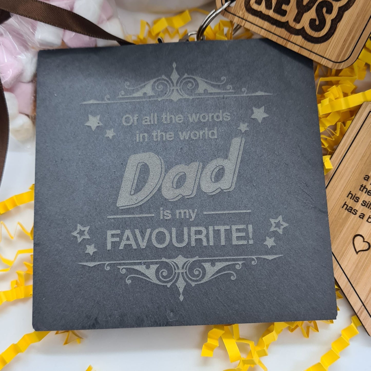 - Slate coaster: Laser-engraved with 'Of all the words in the world, Dad is my FAVOURITE!' with decorative flourishes and stars