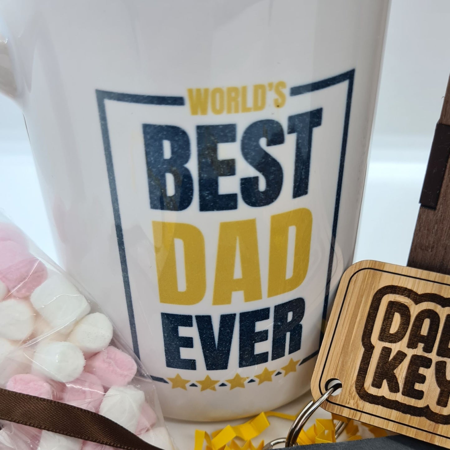This isn't just a gift – it's a complete experience. Every item has been thoughtfully chosen to celebrate Dad, from the 'World's Best Dad Ever' mug perfect for his morning coffee, to the slate coaster declaring he's your favourite, to the practical keyring and charming fridge magnet. And because we know Dad deserves a treat, we've included hot chocolate sachets and marshmallows so he can put that mug to immediate use!