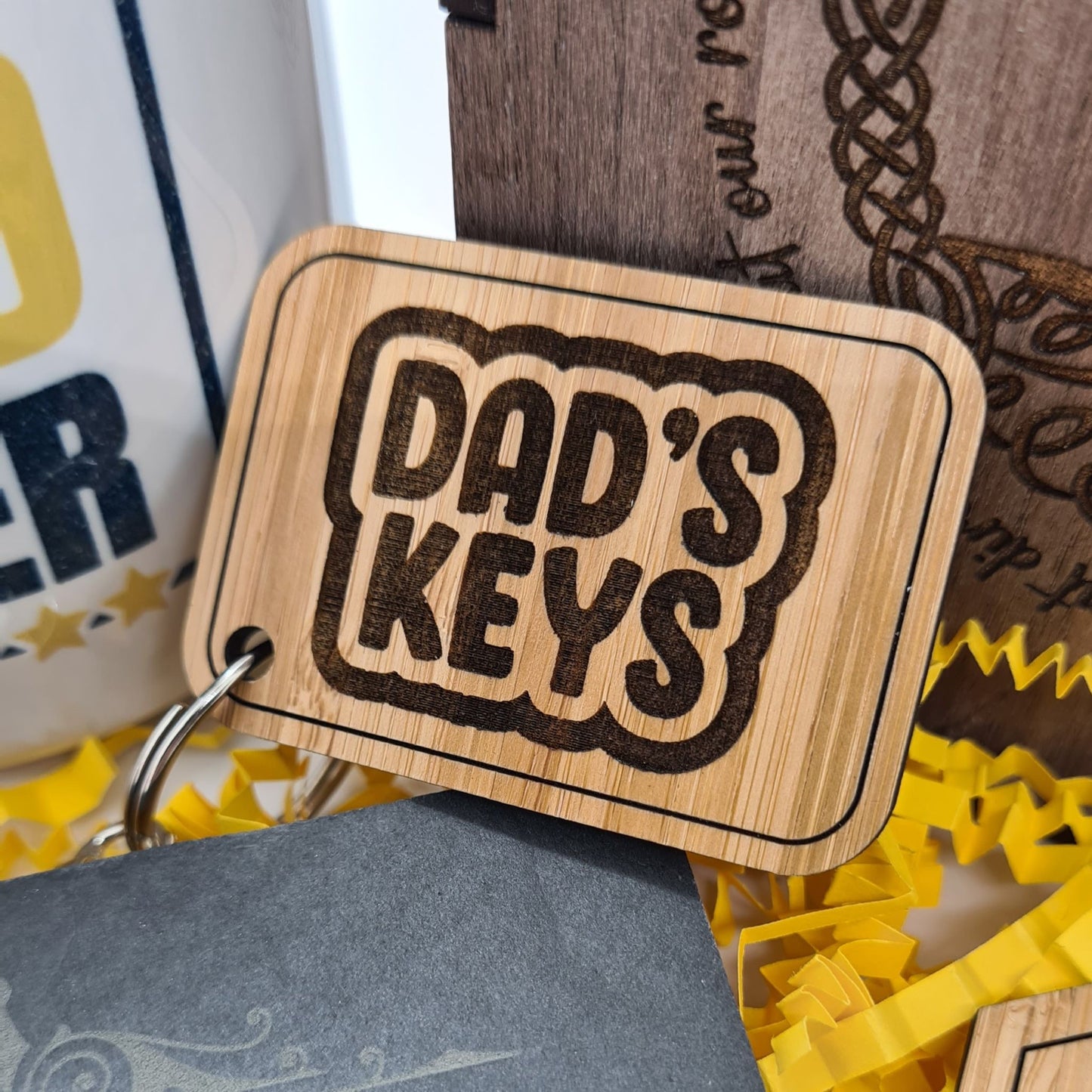 - 'Dad's Keys' wooden keyring: Bold, clear lettering on natural wood with metal split ring