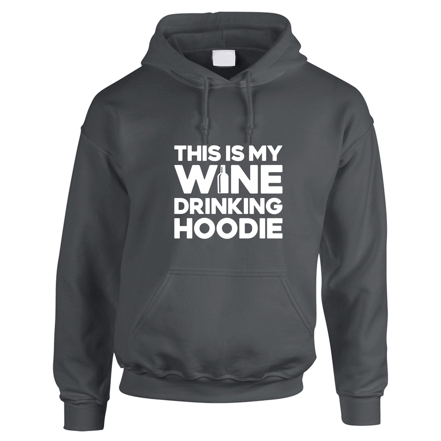 - Design: White text 'THIS IS MY WINE DRINKING HOODIE' with wine bottle silhouette in the 'I' - front chest print