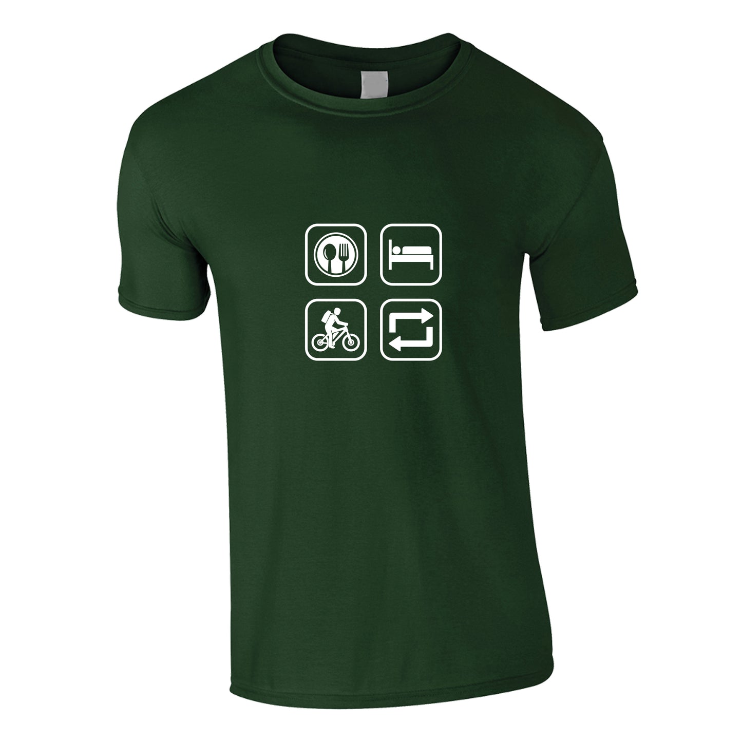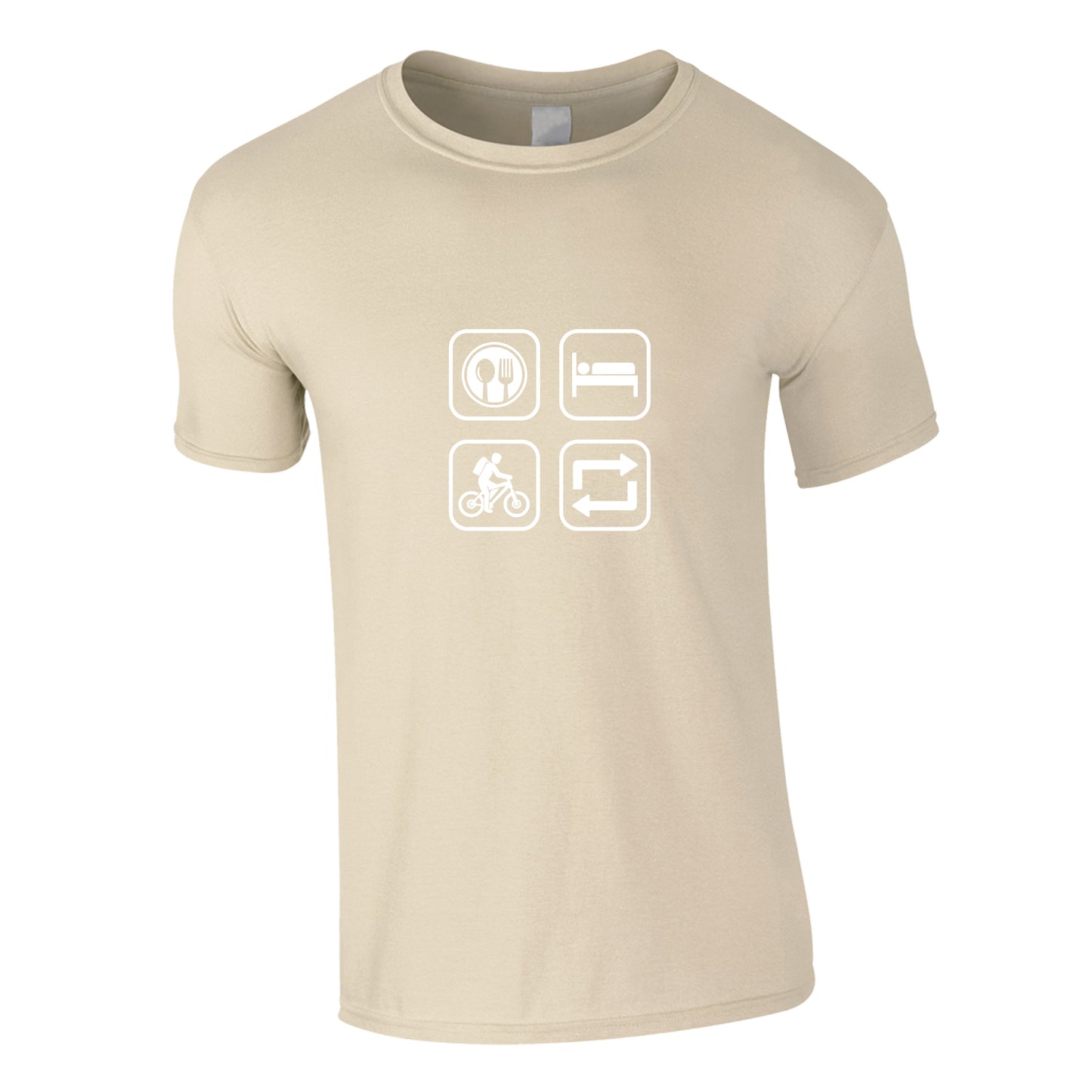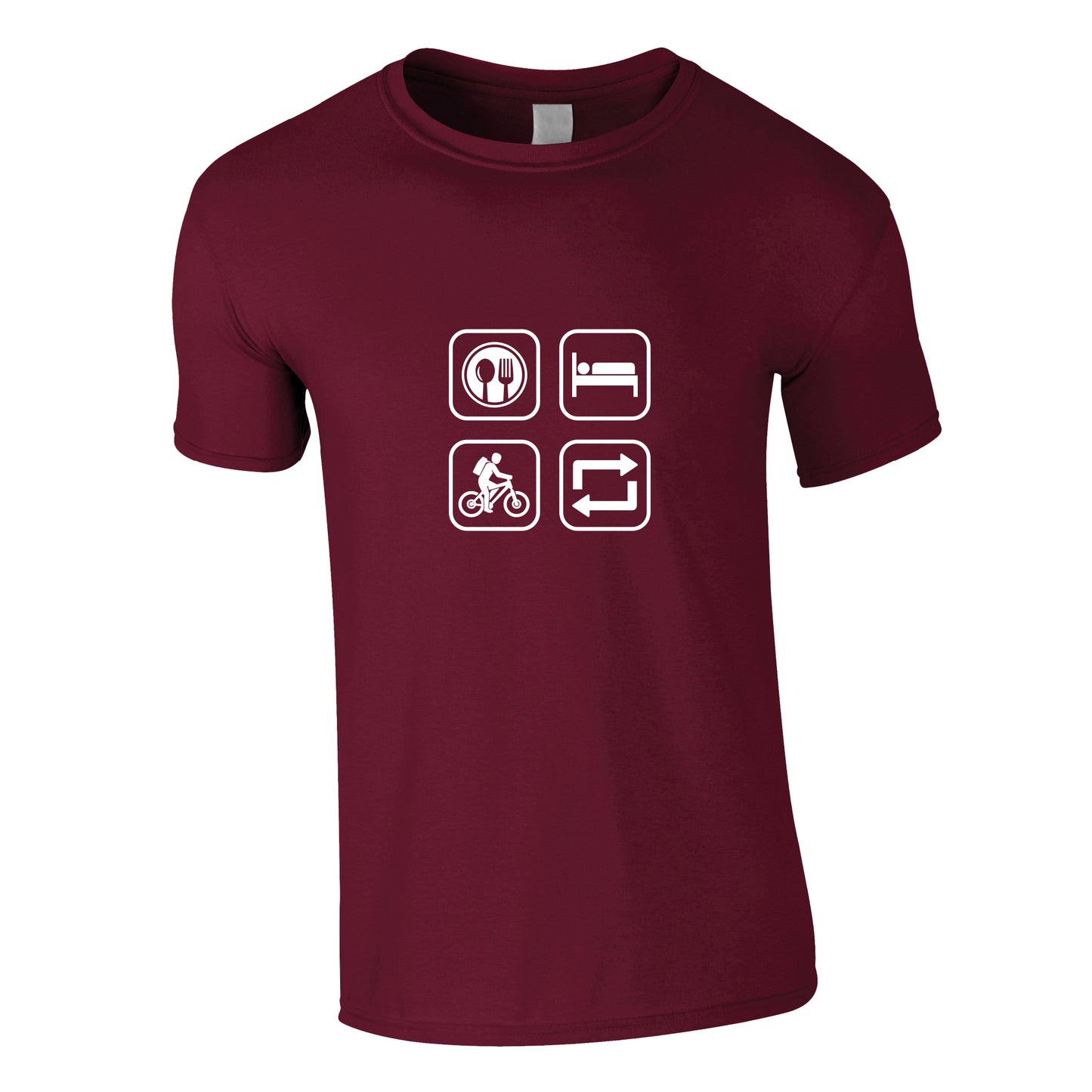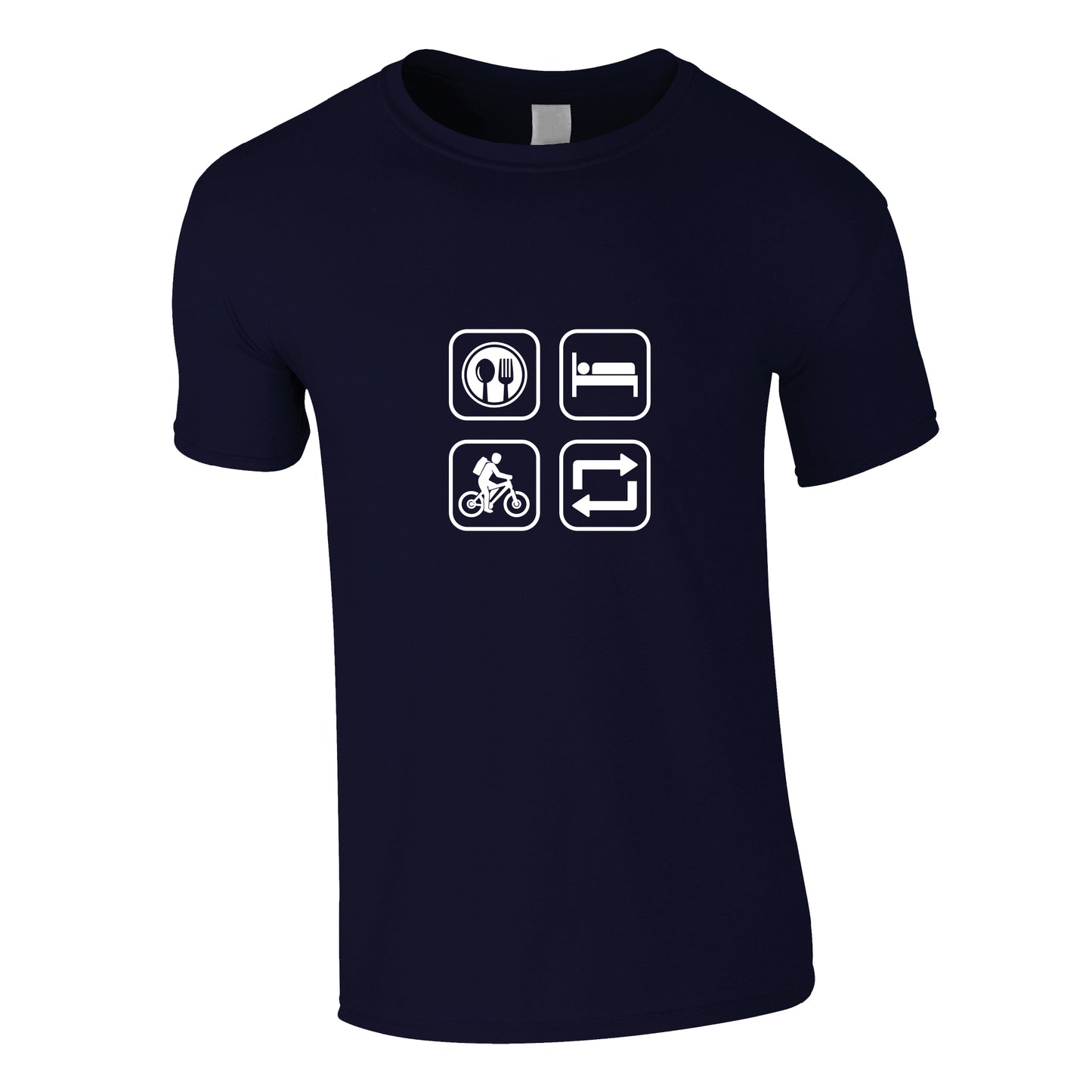Every cyclist knows the rhythm: fuel up with a good meal, get a decent night's sleep (dreaming of that next ride), spend the day in the saddle conquering miles and terrain, and do it all over again. This t-shirt celebrates that simple, satisfying cycle that keeps us coming back to our bikes time and time again.