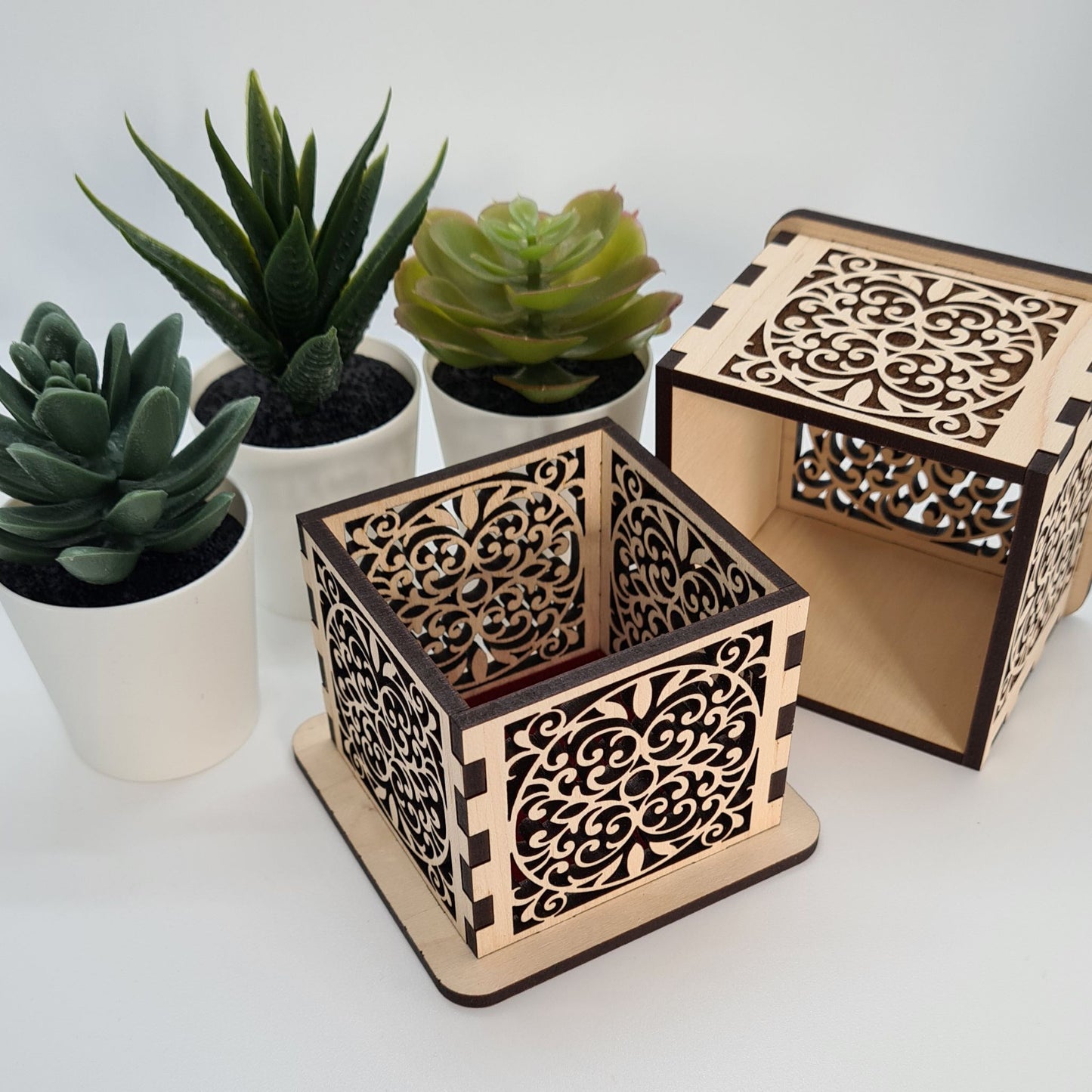 Filigree work has been prized for centuries for its delicate beauty and intricate detail. This laser-cut wooden interpretation brings that same elegance to a functional object, creating something that's both useful and utterly beautiful. The interplay of light and shadow through the cut-through pattern, the precision of the scrollwork, and the warmth of natural wood combine to create a piece that feels both timeless and contemporary.