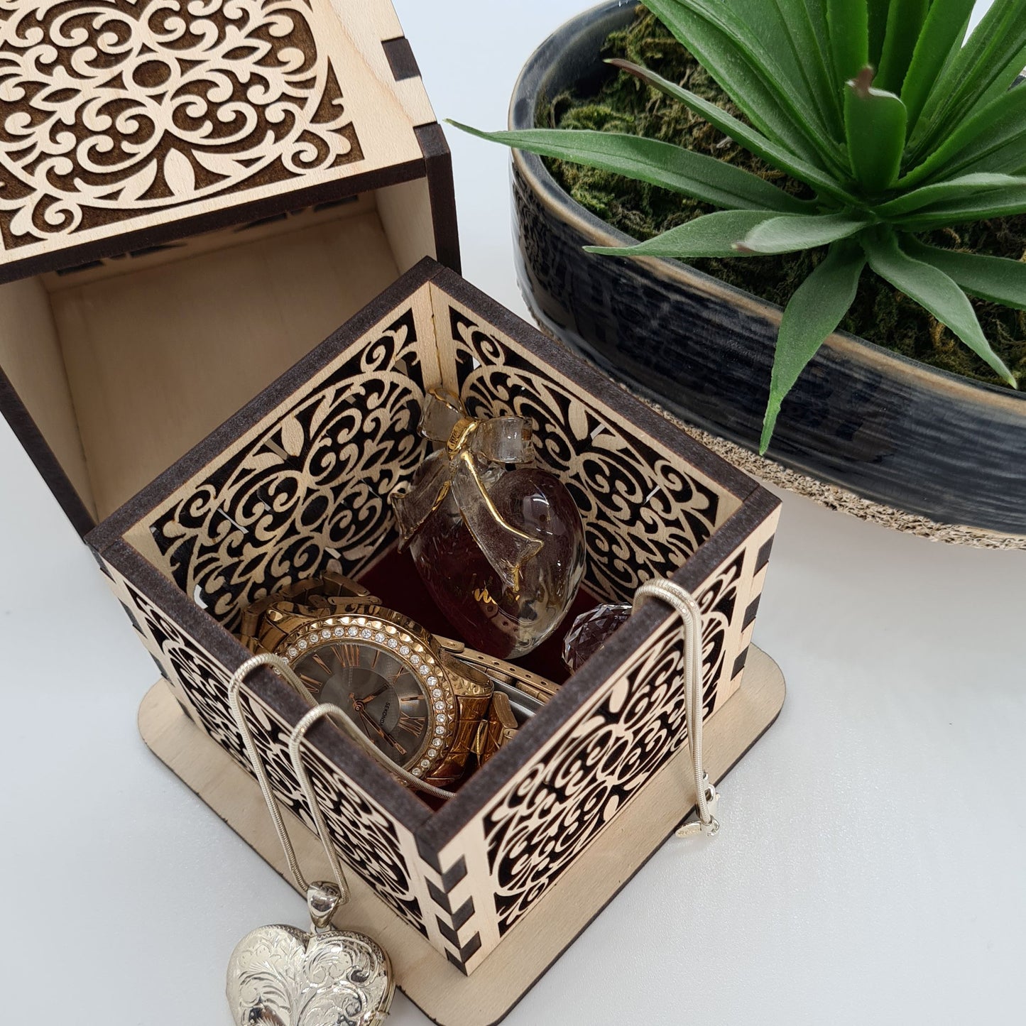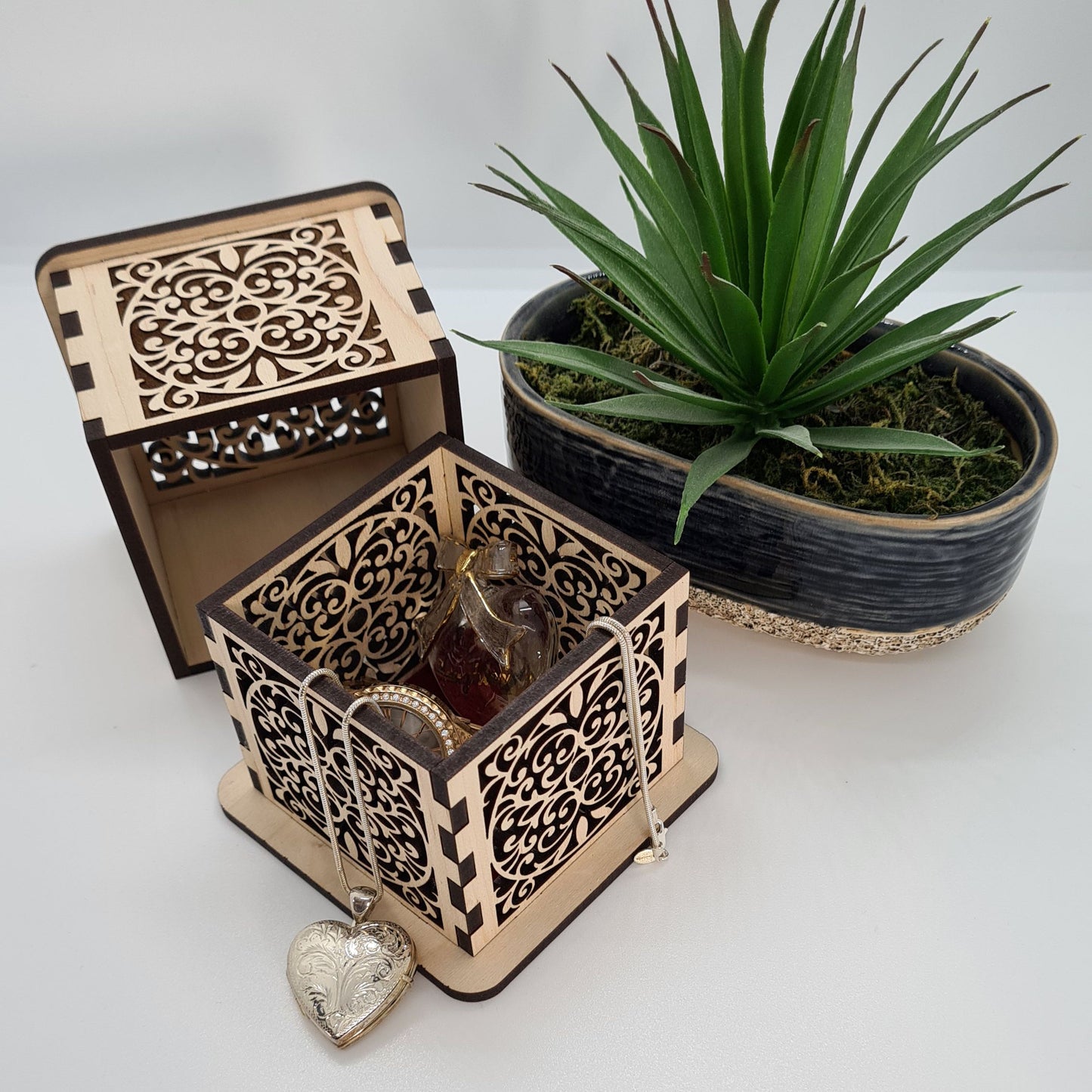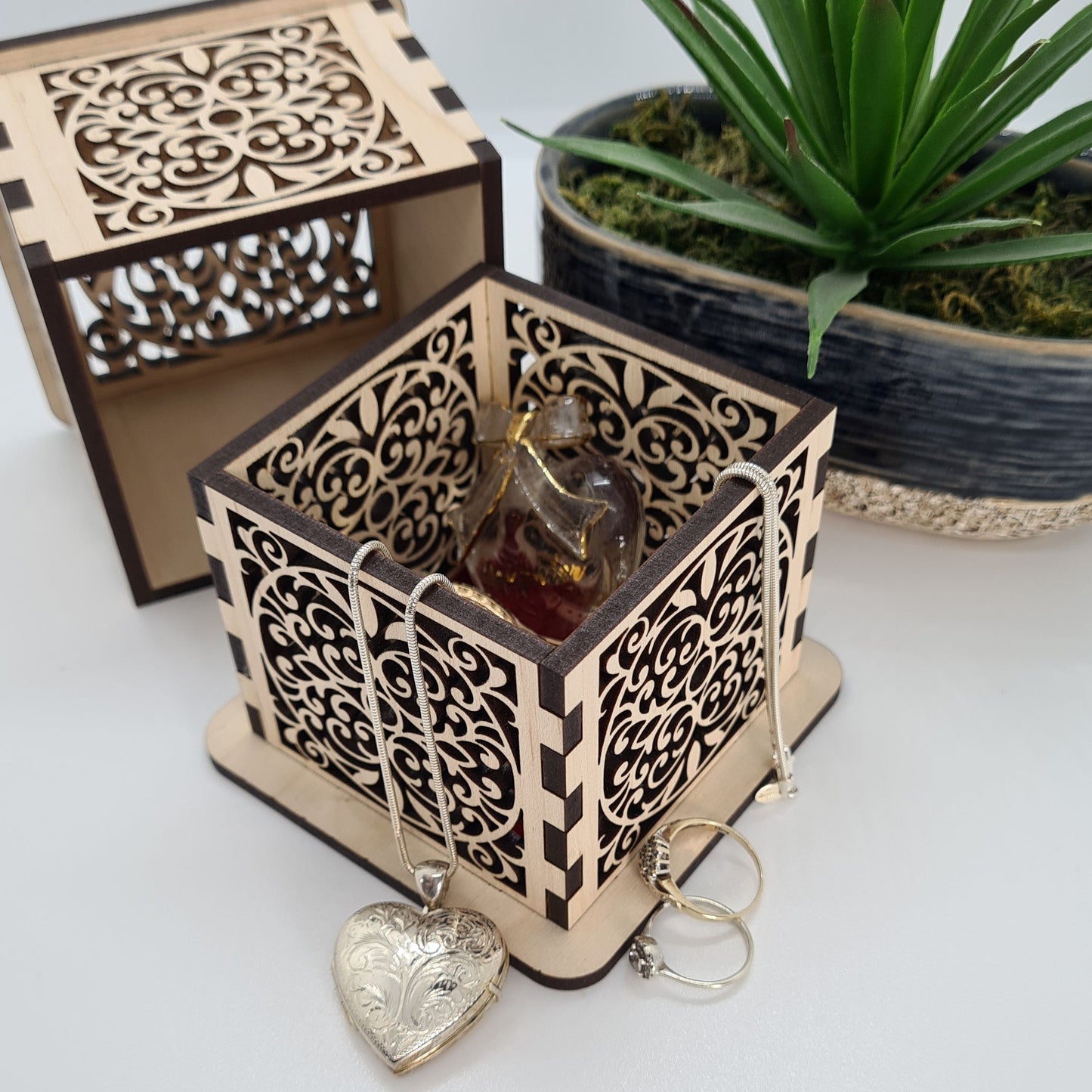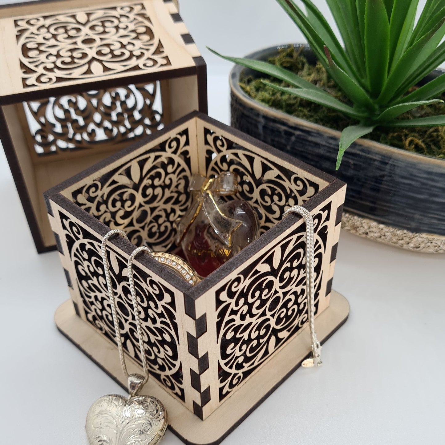 - Intricate laser-cut filigree: Ornate scrollwork pattern on all four sides plus the lid creates a stunning lace-like effect