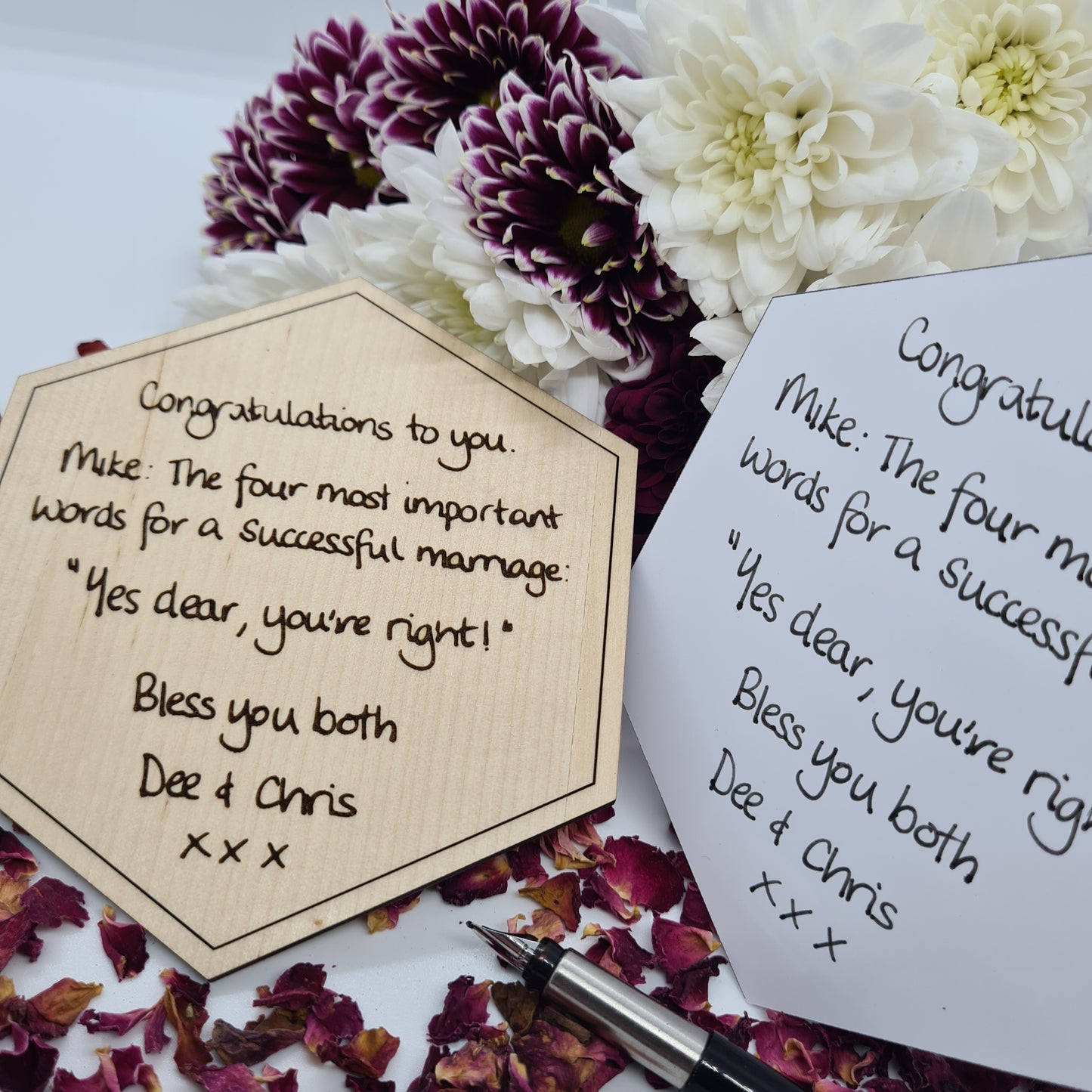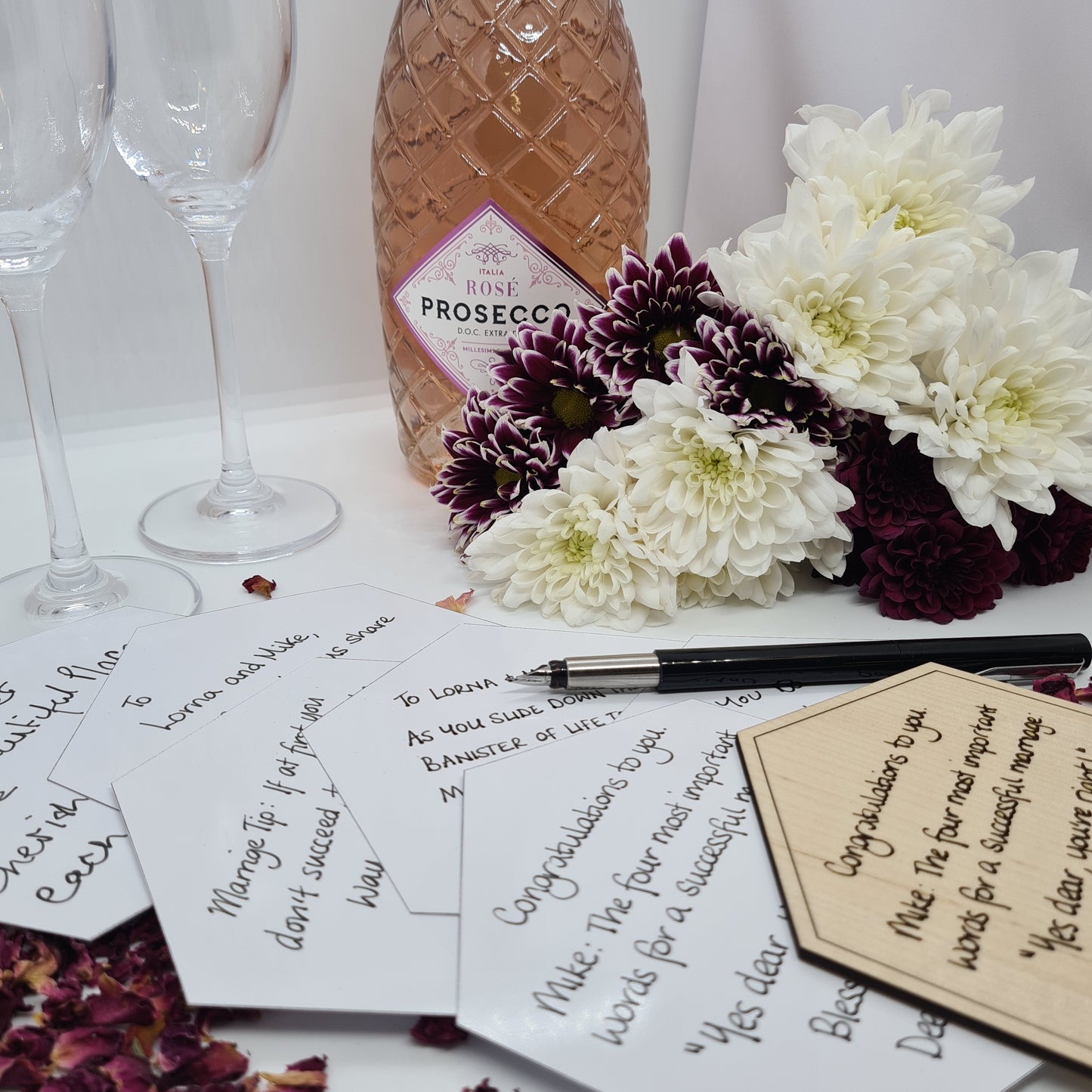 Your wedding day deserves to be uniquely yours, and we're here to bring your vision to life. From elegant wedding signage and thoughtful bridal favours to personalised bridal gifts and fun stag and hen t-shirts, we create bespoke pieces that tell your story. Working closely with you both, we'll weave your chosen theme seamlessly throughout every detail, ensuring a cohesive and memorable celebration that's authentically you. Let's collaborate to make your special day truly unforgettable.